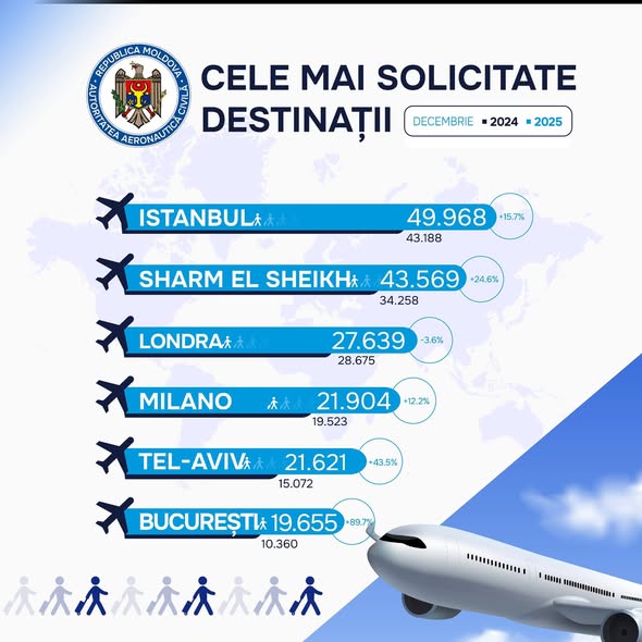În decembrie 2025, Aeroportul Internațional Chișinău a înregistrat peste 469.385 de pasageri, ceea ce reprezintă o creștere de 41,8% față de aceeași lună a anului trecut. Numărul operațiunilor de aeronave a fost de 3.664, cu 39,6% mai multe comparativ cu decembrie 2024.