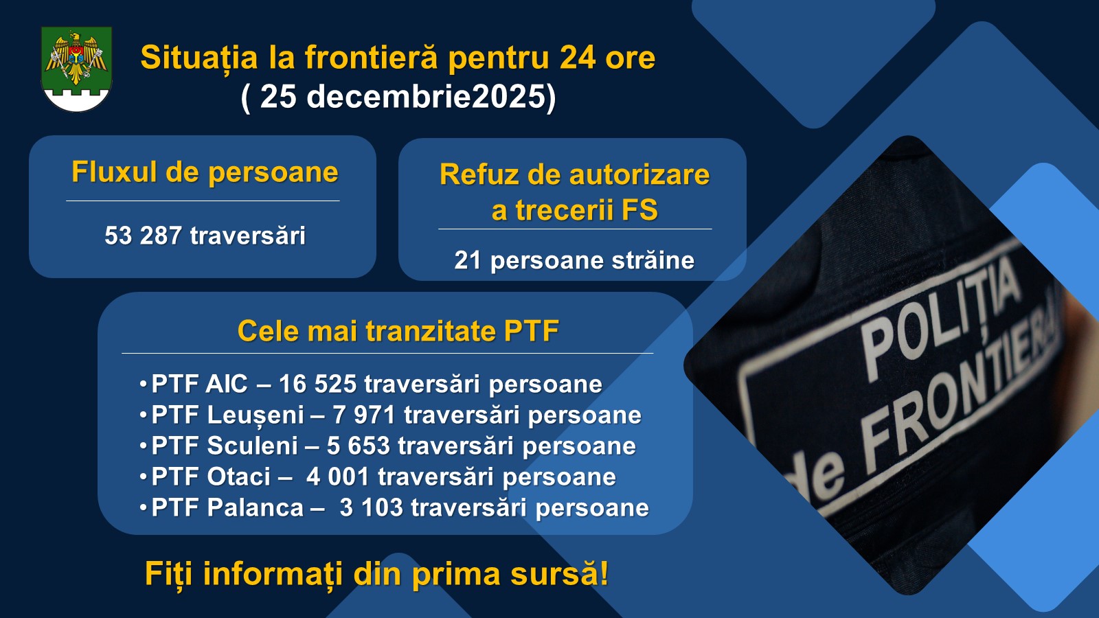 În ultimele 24 de ore, prin punctele de trecere a frontierei de stat au fost înregistrate 53.287 de traversări de persoane, informează Poliția de Frontieră. Cele mai solicitate puncte de trecere au fost Aeroportul Internațional Chișinău, Leușeni, Sculeni, Otaci și Palanca, unde s-a înregistrat cel mai intens flux de călători.